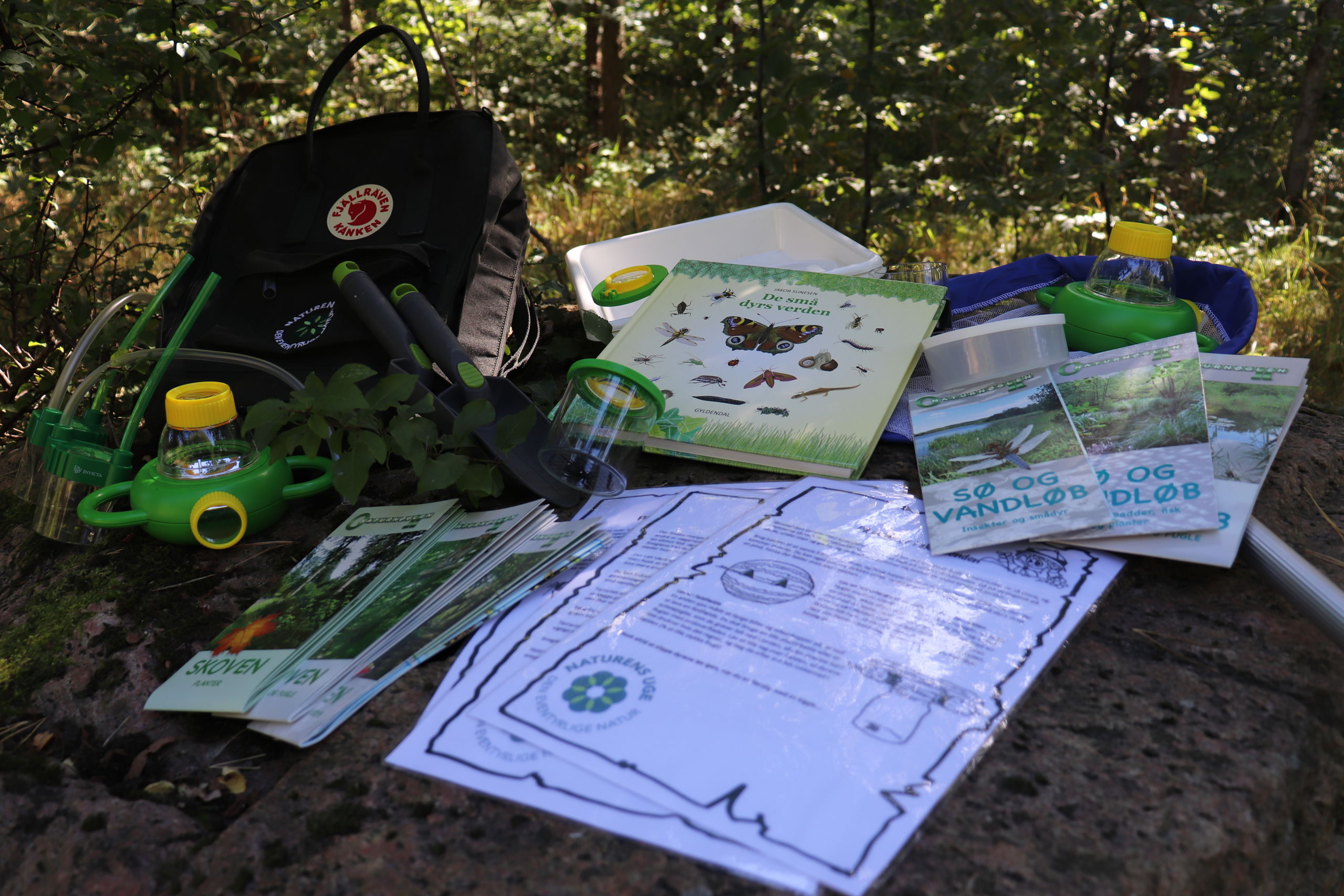Rygsækken rummer udstyr til at give børn sjove og lærerige oplevelser i naturen. I rygsækken finder du blandt andet to børnebøger, en bog og et par foldere med hjælp til de voksne, og en del forskellige remedier, som kan hjælpe de små til at undersøge naturen. Der er for eksempel en insektopsamler, flere forstørrelsesglas og beholdere til både tørre og slimede smådyr!