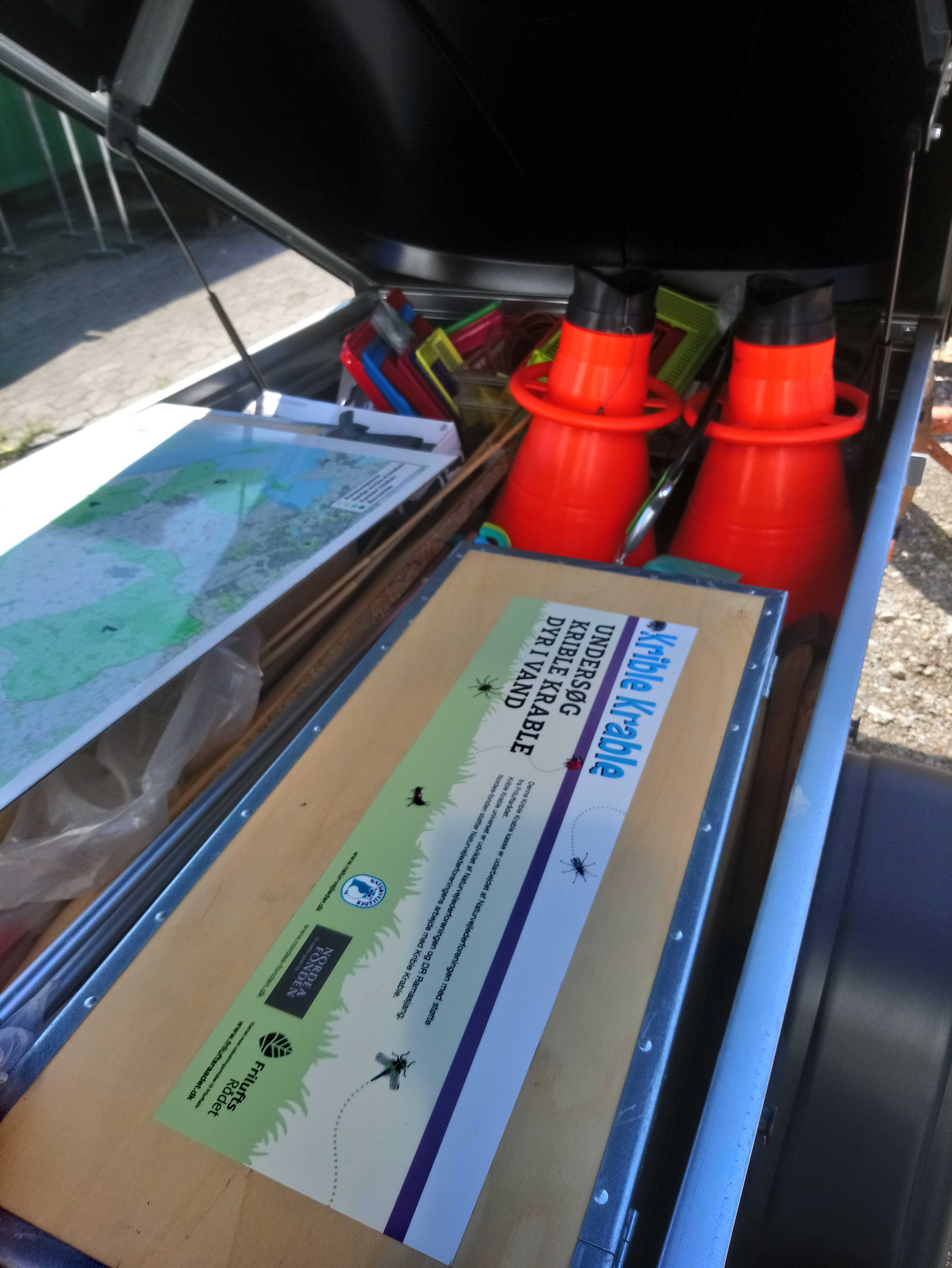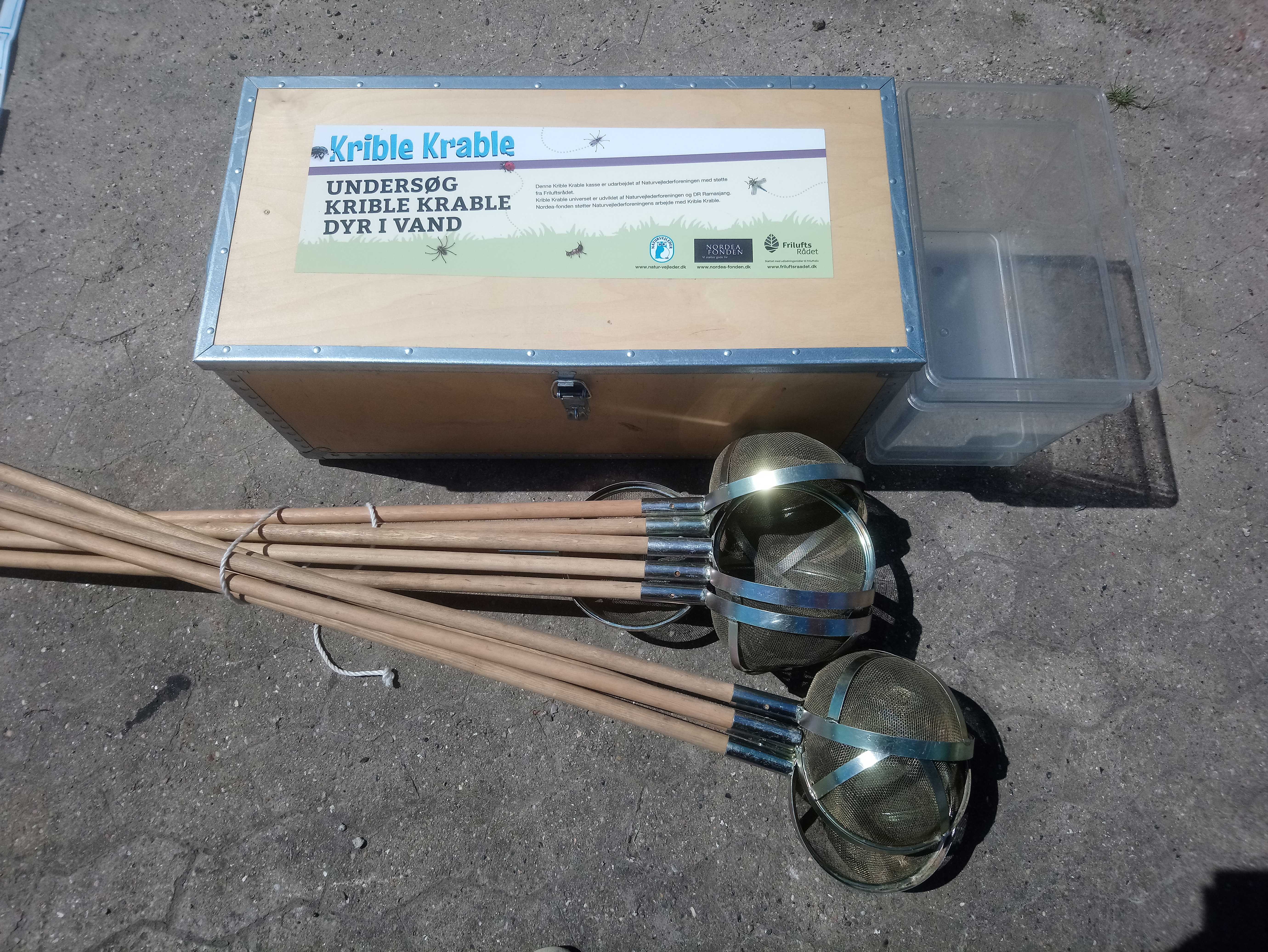 Alle Skoler og SFOer kan låne en flot Krible-Krablekasse fyldt med undersøgelsesgrej og inspirationsmateriale – klar til at tage med ud på Krible-Krable-jagt i naturen. I Nordfyns Kommune har vi ikke mindre end to forskellige grejkasser. En Krible-Krable-grejkasse til land, og en Krible-Krable-grejkasse til vand. Begge kasser er fyldt til randen med grej til gør-det-selv-undersøgelser og aktiviteter, så det er lige til at gå til. Kasserne er ikke større end at de kan være i en bil, dog skal sæderne nok ligges ned, hvis man kører i en mikrobil. Det er også muligt at låne en lille trailer med låg, der kan bruges til transport.