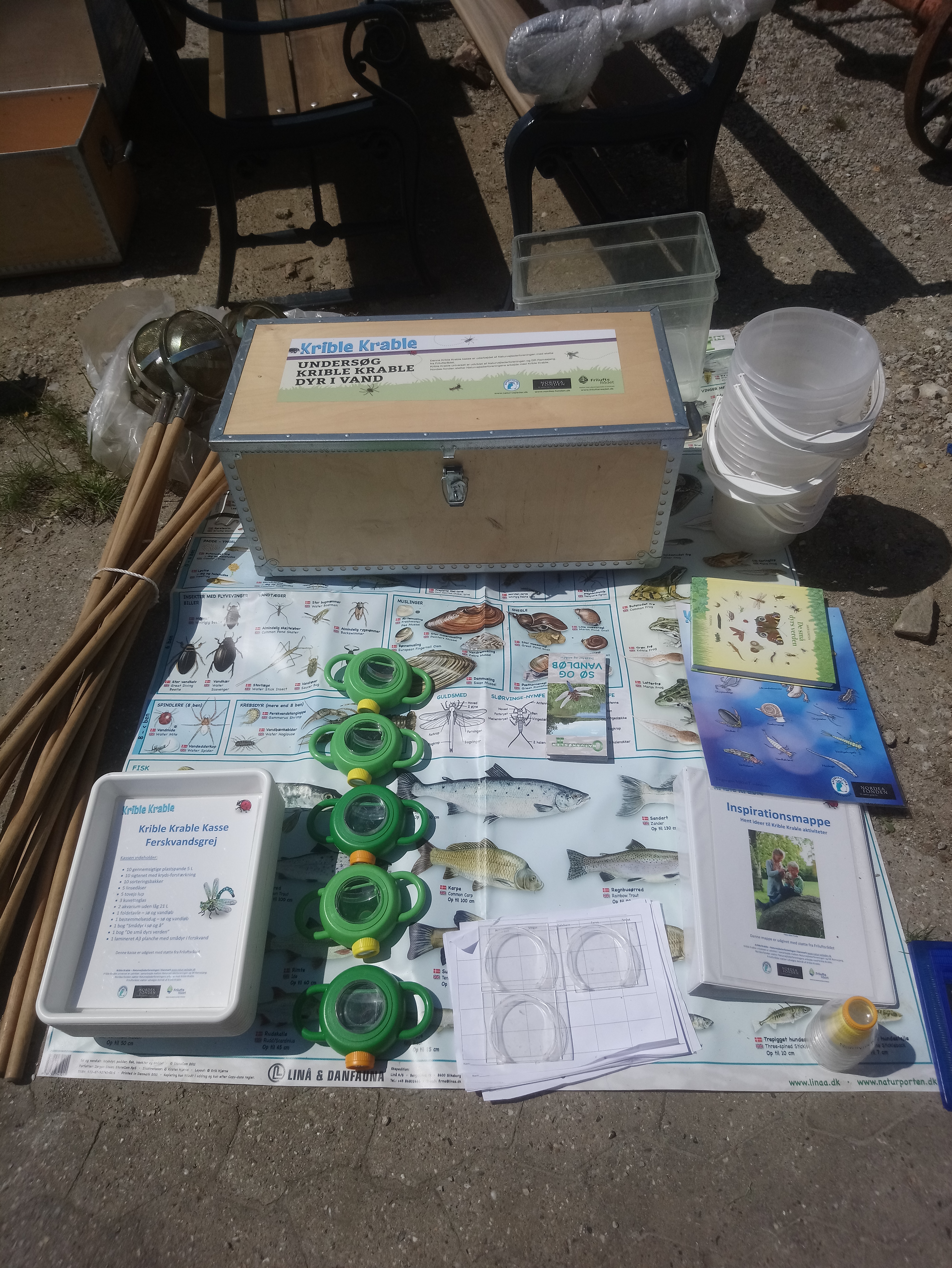 Alle Skoler og SFOer kan låne en flot Krible-Krablekasse fyldt med undersøgelsesgrej og inspirationsmateriale – klar til at tage med ud på Krible-Krable-jagt i naturen. I Nordfyns Kommune har vi ikke mindre end to forskellige grejkasser. En Krible-Krable-grejkasse til land, og en Krible-Krable-grejkasse til vand. Begge kasser er fyldt til randen med grej til gør-det-selv-undersøgelser og aktiviteter, så det er lige til at gå til. Kasserne er ikke større end at de kan være i en bil, dog skal sæderne nok ligges ned, hvis man kører i en mikrobil. Det er også muligt at låne en lille trailer med låg, der kan bruges til transport.